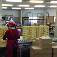 多ロット、多製品、資材が必要となるギフト製品のセット加工は、必要な資材、製品を大量ストックし、大量梱包を行うことが可能です。 大ロットの梱包作業を短時間に行うことができます。