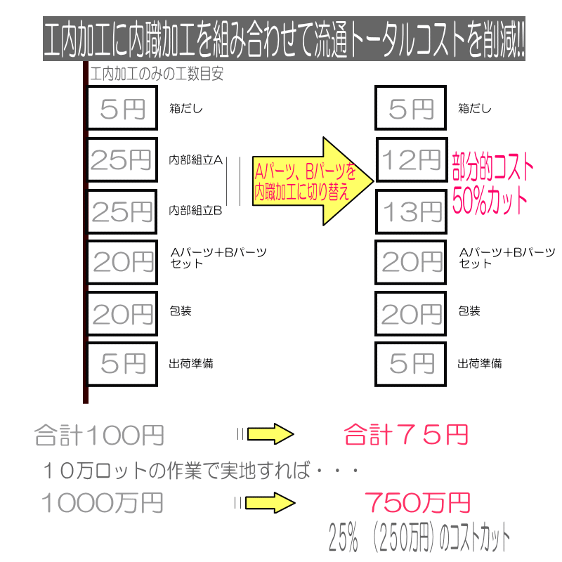 手加工が必要な国内流通加工での究極のコストダウン 上手に組合せをすれば全体コストの削減に貢献できます。